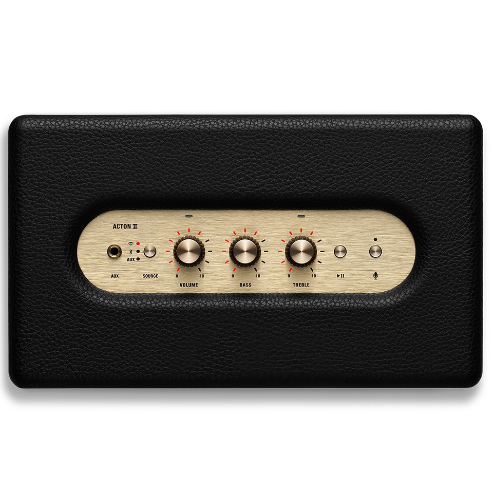 Phía sau loa vẫn là cổng số 8 quen thuộc 35W. Và cũng như mọi thành viên khác, Acton II cũng được trang bị nút chỉnh bass và treble ngay trên loa bên cạnh nút vặn tăng/giảm âm lượng. Các nút này được bao quanh bởi các vạch LED màu đỏ nhạt. Ngoài ra bảng điều khiển còn có nút chuyển đổi giữa bluetooth và AUX bên cạnh một đầu vào 3.5 mm. Đáng nói là nhà sản xuất đã loại bỏ hai cổng kết nối có dây Optical và RCA mà chỉ giữ lại cổng AUX 3.5mm, nên việc nâng cấp Bluetooth lên 5.0 là rất cần thiết. Giờ đây chất lượng truyền dẫn không dây đã tốt hơn, và khoảng cách kết nối cũng xa hơn.